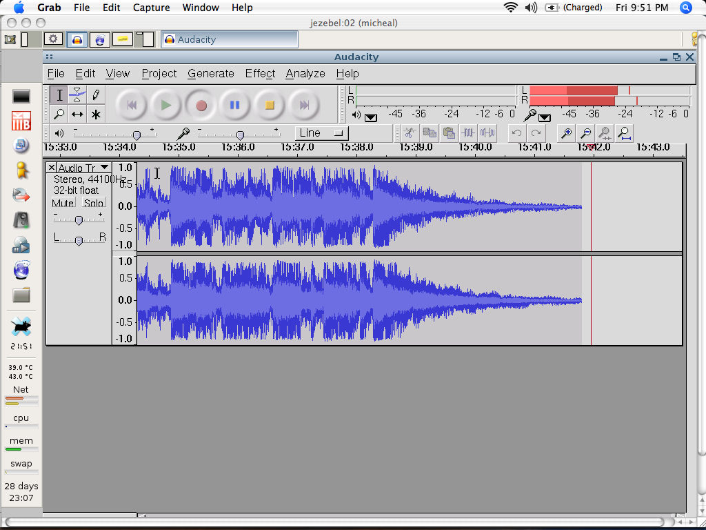 In Audacity I play the record watch the levels when it peaks, moving the record level slider correctly so it's right around 0 since I don't want it to be too loud and end up distorted. I hit record in Audacity and start playing the record, checking the levels and making sure the sound is coming through and then sit back and listen to the wonderful sounds of 30 year old vinyl playing away. Once the side is recorded I cut off the beginning and end silence and save it as a WAV file which is usually around 190Mb or so. I do this for each record, being careful not to bump the turntable or cause any excessive disk activity on the computer that would distort the sound.