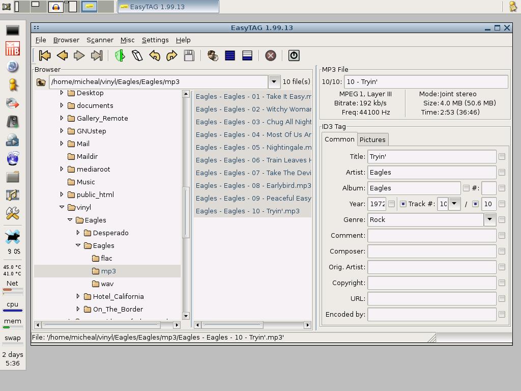 Using the program EasyTag I then load that directory, and use the GNUDB manual lookup to find the proper album, click apply to all tracks, then save the tags and file names. This will rename the tracks correctly and fill out all the ID3v2 tags, making it a lot easy to catalog and use with MP3 players.