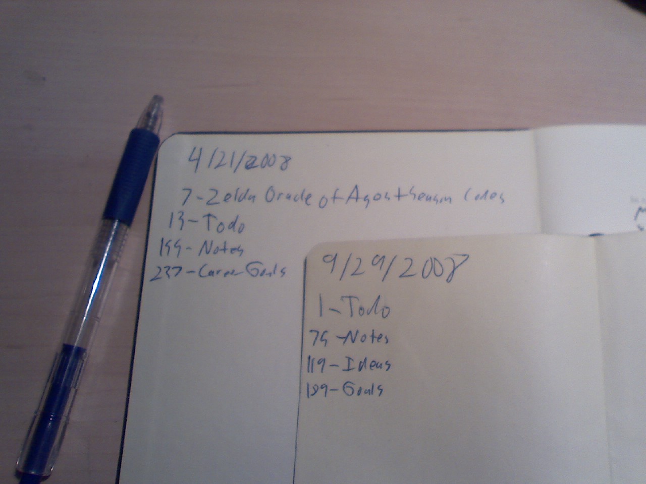 That's it! The only real difference is the personal one has an Ideas section as well, which is for longer more drawn out thoughts than just a standard to-do list or jotting down notes. Each one has the last few pages reserved for both life and career goals and an estimation of when I'd like to complete them. In general there's not specific page format for my personal one, I just put things down in the proper section and if they're important mark them on the TOC.