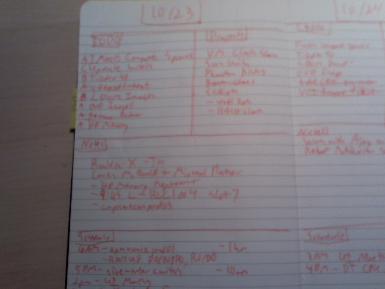My professional one however does have a specific format for the to-do pages which I semi-copied from the time management book. I first date the top of the page, then split the first third of te page into a general todo and project list. Every morning when I first get into work I lay down my todo list, adding new items from our ticket system or email. Each todo item is then assigned a value (A, B, C) depending on it's priority and I get to work, crossing them off as they are done. The ones that aren't done at the end of the day are then moved to the next days list and marked with a - to show they were moved. The projects side is more just to keep in mind what I'd like to accomplish in a more long term sense. The second third of the page is for general notes, small scribblings on something I'm working on, random commands, etc. The final third is a ad-hoc schedule that I just fill in with times for meetings and other appointments that I have during the day. I don't fill any out ahead of time since I let my Outlook calendar keep track of recurring meetings and appointments.