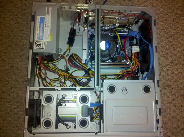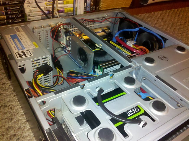The system setup is 64-bit Debian Squeeze installed onto the SSD, with /home all on the large disk. I also installed Windows XP into a KVM guest which resides on the SSD as well. GNOME is setup and running off the video card. HDMI out works for video and looks great, however I kept getting stumped on trying to pass sound through it and settled on a 1/8 audio connection from the line out.