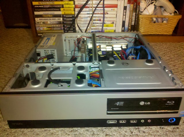 The drive setup was a big improvement as well. Before it was running the OS off a compact-flash card plugged into a parallel IDE connection, two 1TB drives on the onboard SATA, and the blu-ray into a SATA PCI card. This was less than ideal from an IO perspective and was still running on legacy technology. The new board has 4 SATA connections and I swapped the two drives for one 2TB disk. The SSD has shown a huge IO boost and the OS boots in less than 10 seconds. The 2TB drive is actually slow at 5900 RPMs, but it makes it quieter and is very power efficient.